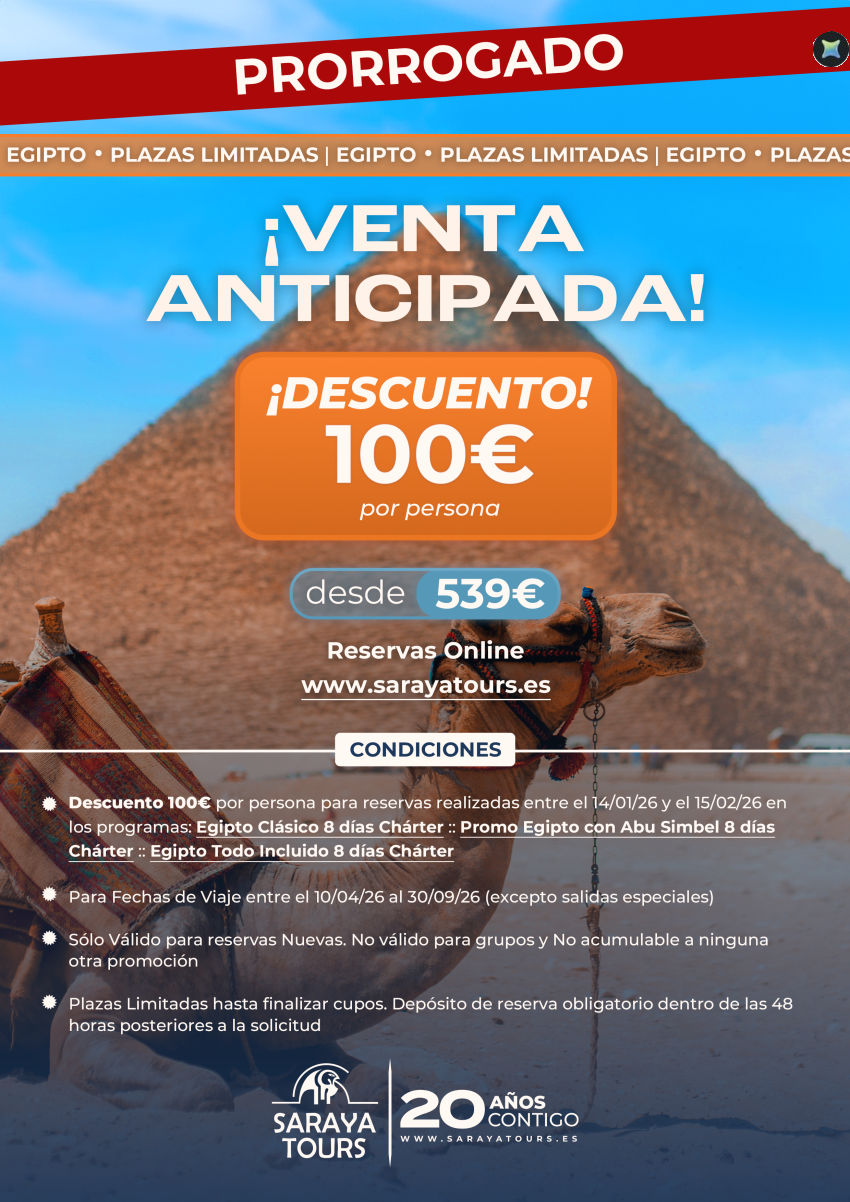 ¡¡ EGIPTO Venta Anticipada !! Descuento 100 € p.persona. Salidas 10/04/26 al 30/09/26. Consultar condiciones.